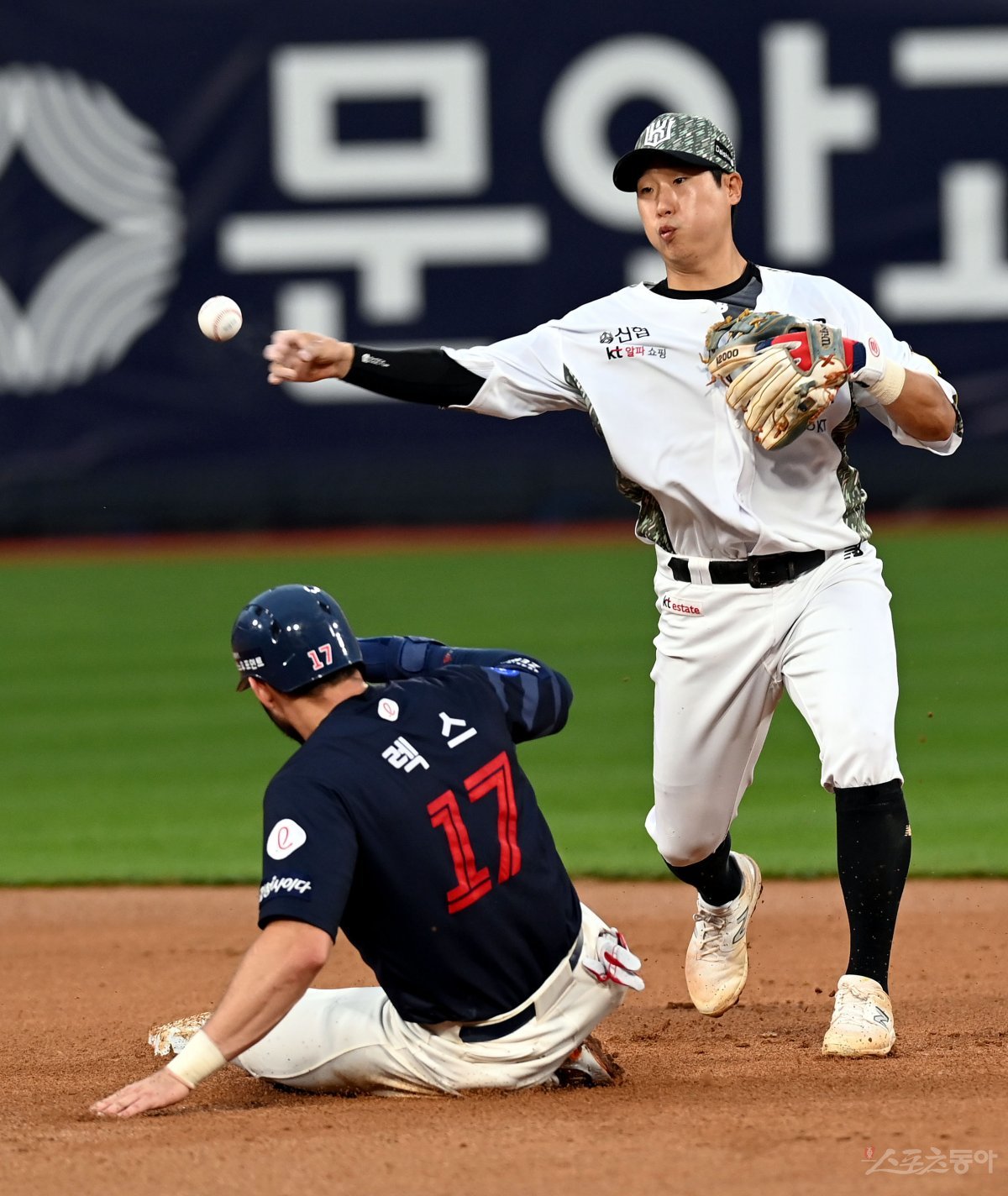 21일 경기도 수원 kt위즈파크에서 ‘2023 신한은행 SOL KBO리그’ kt 위즈와 롯데 자이언츠의 경기가 열렸다. 4회초 무사 1루에서 내야땅볼 때 kt 이호연이 롯데 1루 주자 렉스를 2루에서 포스 아웃시킨 후 1루로 송구하고 있다.