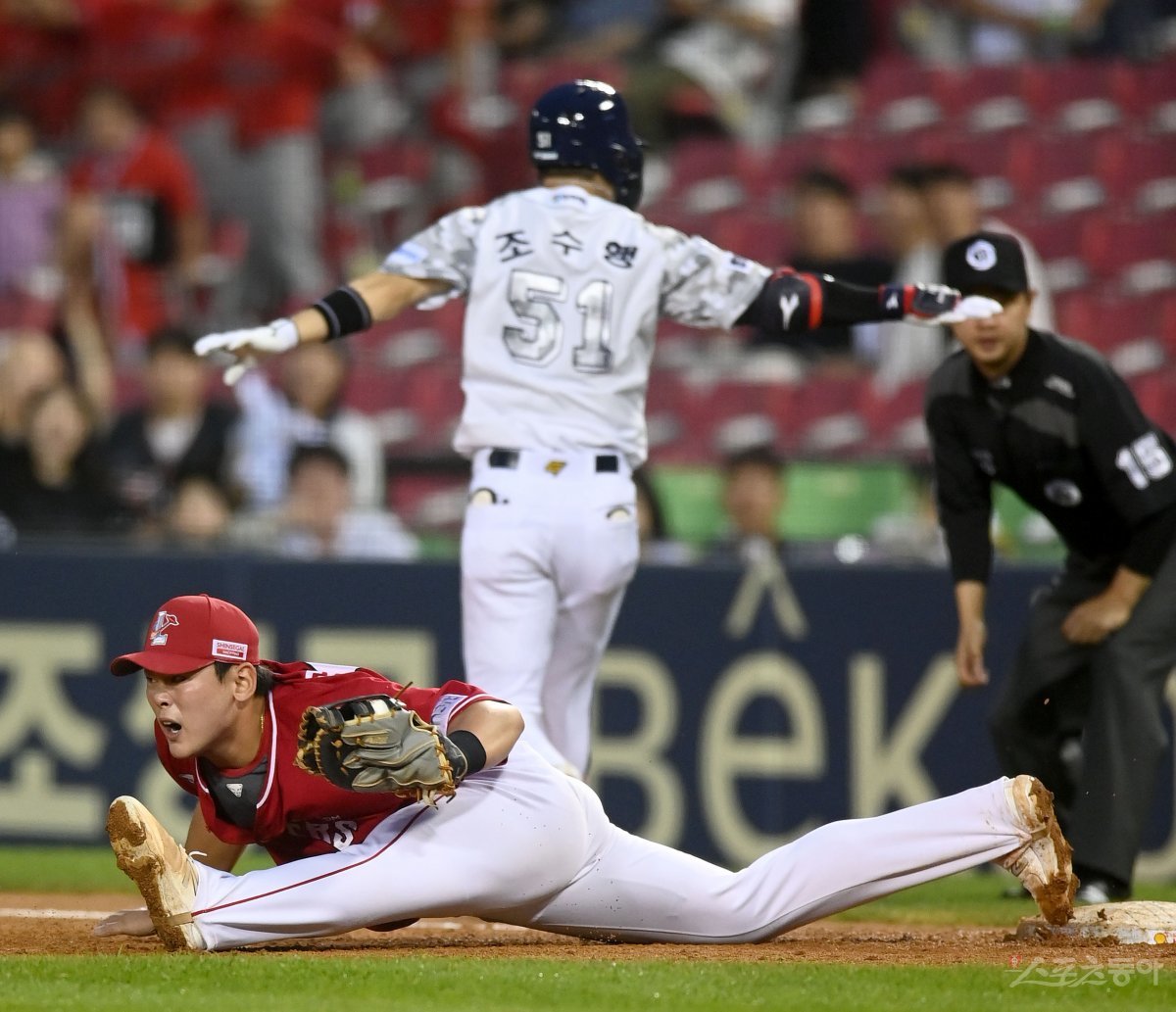 21일 서울 잠실야구장에서 ‘2023 신한은행 SOL KBO리그’ SSG 랜더스와 두산 베어스 경기가 열렸다. 4회말 2사 1루 두산 조수행이 내야 땅볼을 치고 1루에서 세이프 되고 있다.