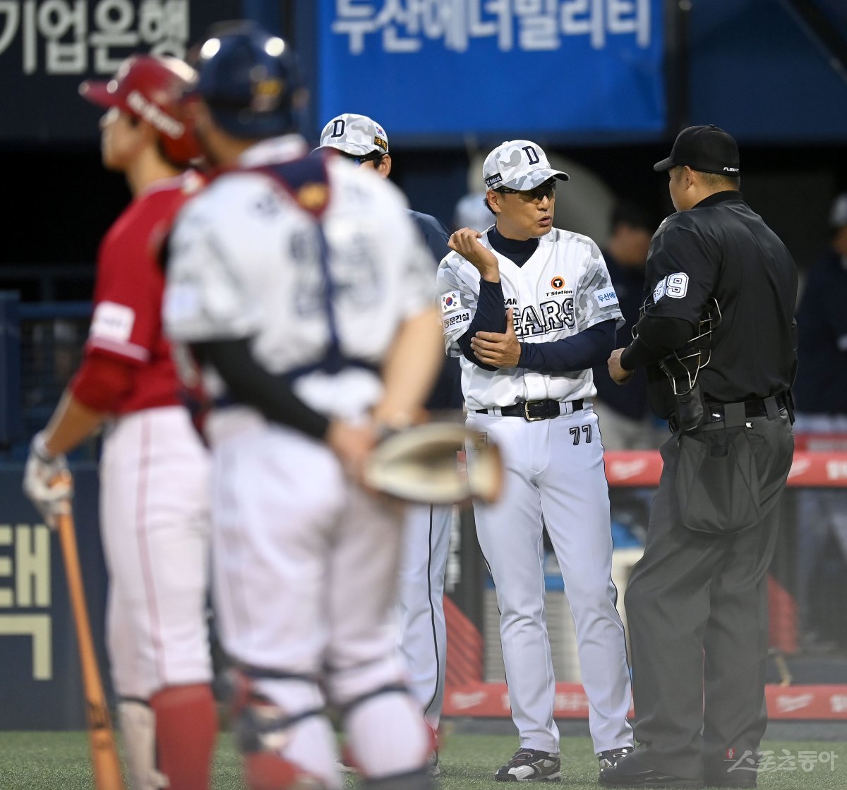 21일 서울 잠실야구장에서 ‘2023 신한은행 SOL KBO리그’ SSG 랜더스와 두산 베어스 경기가 열렸다. 4회초 1사 2루 두산 이승엽 감독이 SSG 에레디아의 데드볼 판정에 대해 항의하고 있다.