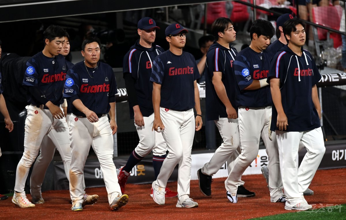 21일 경기도 수원 kt위즈파크에서 ‘2023 신한은행 SOL KBO리그’ kt 위즈와 롯데 자이언츠의 경기가 열렸다. kt에 2-8로 패한 롯데 선수들이 경기 종료 후 그라운드로 향하고 있다.