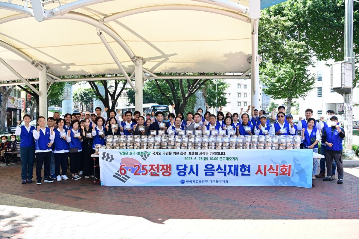 한국자유총연맹 대구동구지회는 지난 23일, 큰고개오거리에서 6.25 전쟁의 참상을 알리고 안보의식을 굳건히 하는 계기를 마련하기 위해 6.25 전쟁 당시 음식 재현 및 시식회를 개최했다.