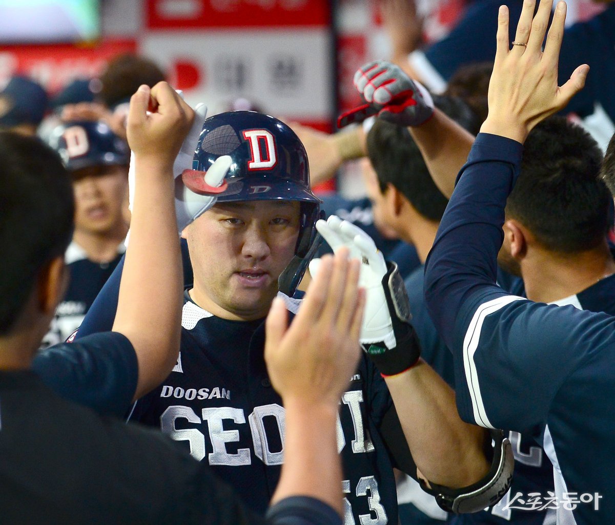 25일 서울 고척스카이돔에서 ‘2023 신한은행 SOL KBO리그’ 두산 베어스와 키움 히어로즈 경기가 열렸다. 5회초 무사 두산 양석환이 좌월 투런 홈런을 날리고 그라운드를 돌아 홈인해 하이파이브 하고 있다.