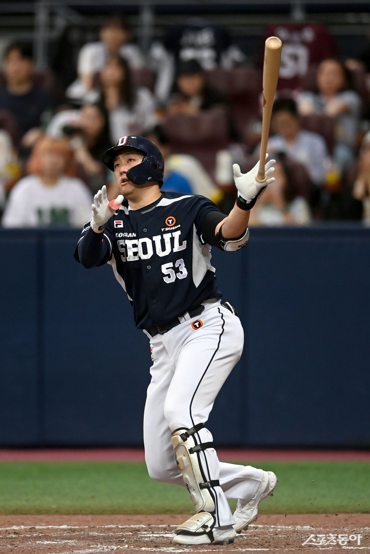 25일 서울 고척스카이돔에서 ‘2023 신한은행 SOL KBO리그’ 두산 베어스와 키움 히어로즈 경기가 열렸다. 5회초 무사 두산 양석환이 좌월 투런 홈런을 날리고 있다.