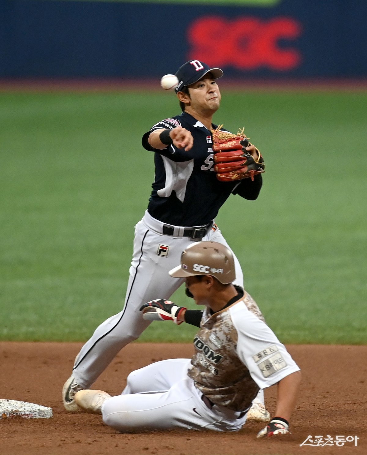 25일 서울 고척스카이돔에서 ‘2023 신한은행 SOL KBO리그’ 두산 베어스와 키움 히어로즈 경기가 열렸다. 2회말 1사 1루 키움 내야 땅볼 때 두산 강승호가 1루주자를 포스 아웃시킨 후 1루로 송구하고 있다.