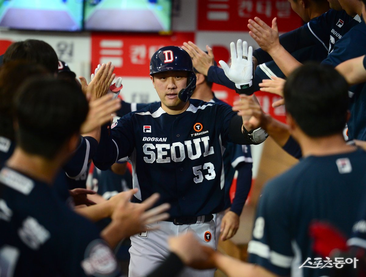 25일 서울 고척스카이돔에서 ‘2023 신한은행 SOL KBO리그’ 두산 베어스와 키움 히어로즈 경기가 열렸다. 6회초 1사 1루 두산 양석환이 좌월 투런 홈런을 날리고 그라운드를 돌아 홈인해 하이파이브 하고 있다.