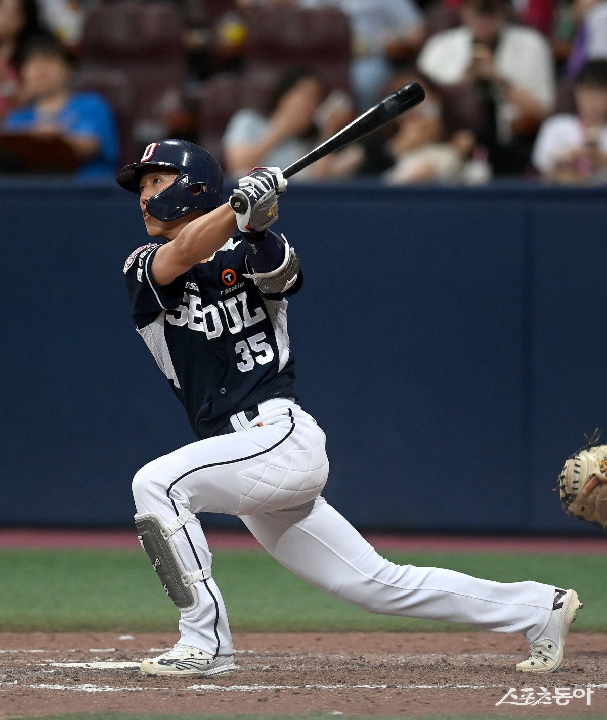 25일 서울 고척스카이돔에서 ‘2023 신한은행 SOL KBO리그’ 두산 베어스와 키움 히어로즈 경기가 열렸다. 8회초 1사 2루 두산 전민재가 1타점 중전 2루타를 치고 있다.