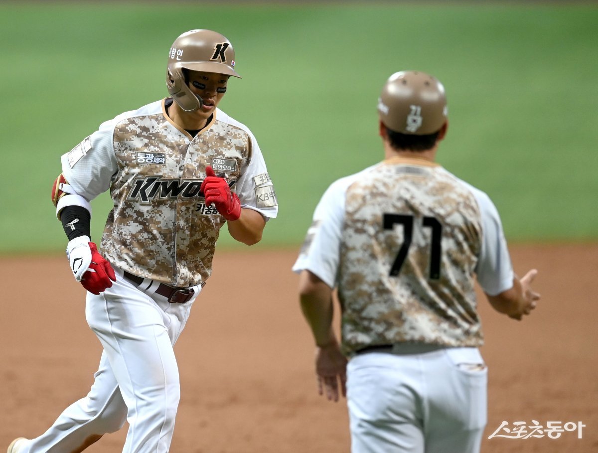 25일 서울 고척스카이돔에서 ‘2023 신한은행 SOL KBO리그’ 두산 베어스와 키움 히어로즈 경기가 열렸다. 7회말 2사 키움 송성문이 우월 솔로 홈런을 날린 후 그라운드를 돌고 있다.