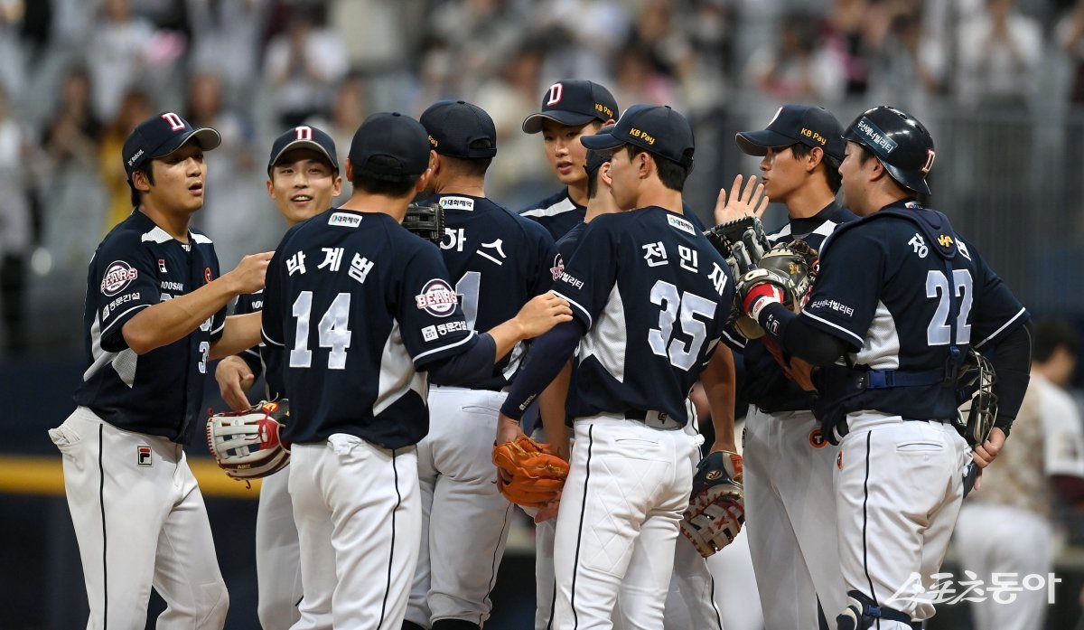 25일 서울 고척스카이돔에서 ‘2023 신한은행 SOL KBO리그’ 두산 베어스와 키움 히어로즈 경기가 열렸다. 17-2 대승을 거둔 두산 선수들이 하이파이브 하고 있다.