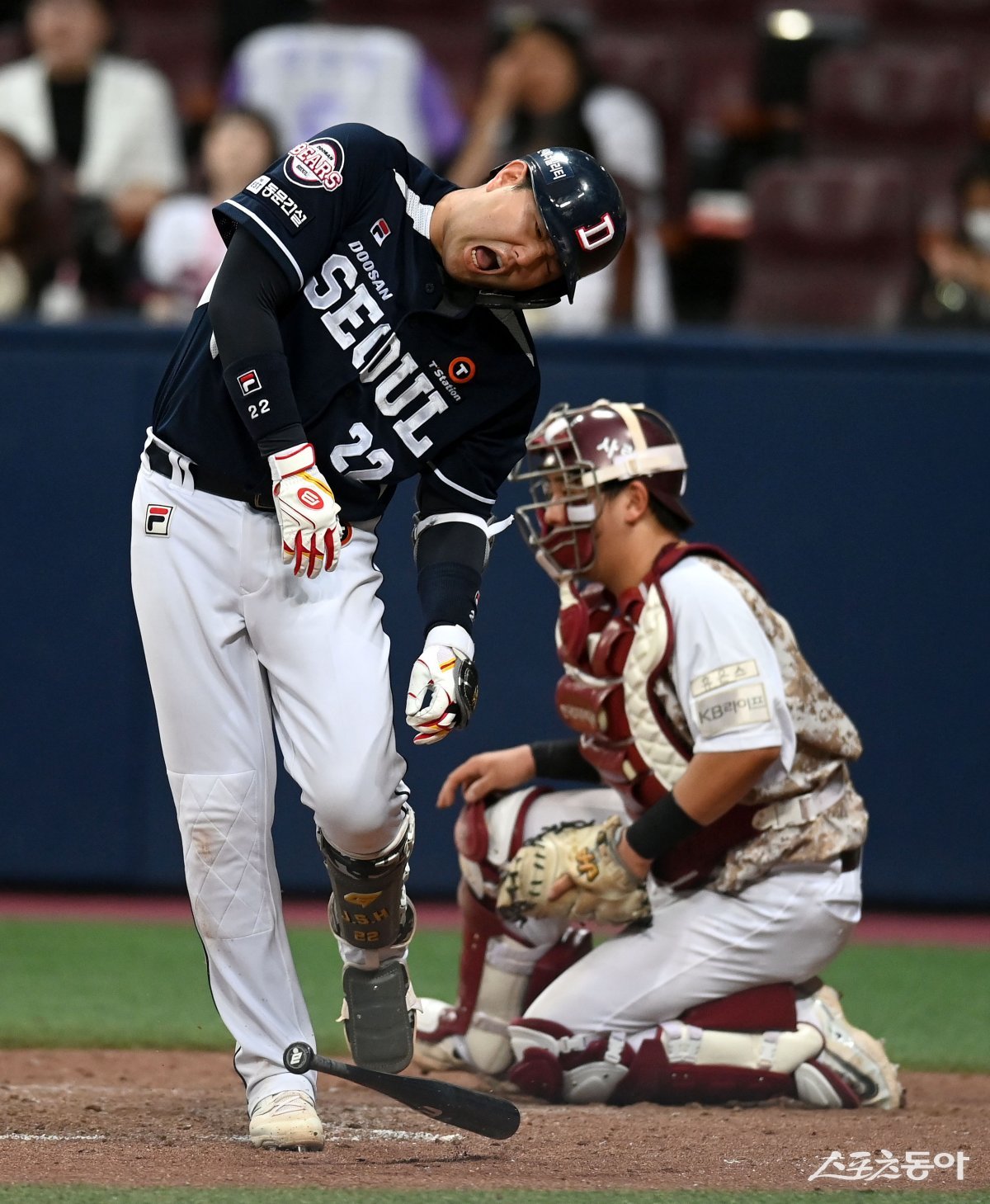 25일 서울 고척스카이돔에서 ‘2023 신한은행 SOL KBO리그’ 두산 베어스와 키움 히어로즈 경기가 열렸다. 9회초 무사 두산 장승현이 몸에 맞는 볼을 맞고 고통스러워하고 있다.