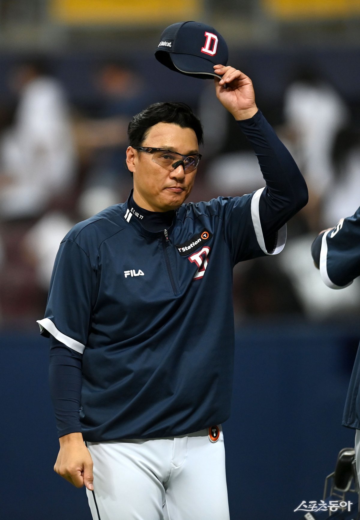 25일 서울 고척스카이돔에서 ‘2023 신한은행 SOL KBO리그’ 두산 베어스와 키움 히어로즈 경기가 열렸다. 17-2 대승을 거둔 후 두산 이승엽 감독이 팬들에게 인사하고 있다.