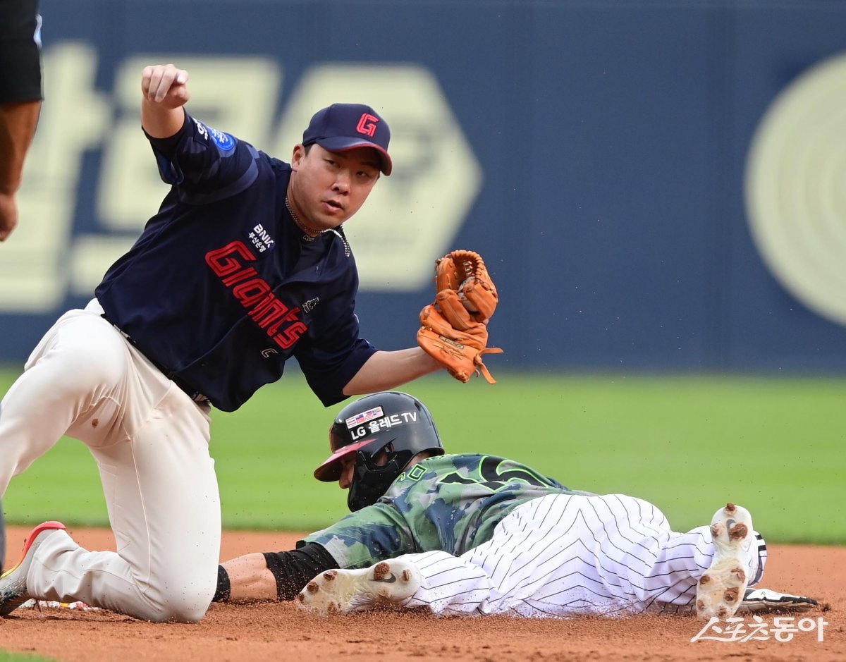 25일 서울 잠실야구장에서 열린 ‘2023 신한은행 SOL KBO리그’ LG 트윈스와 롯데 자이언츠의 경기에서 2회말 1사 1, 2루 상황에서 롯데 2루수 안치홍이 도루를 시도한 1루주자를 태그했지만 타자의 볼넷 선언으로 세이프 됐다.