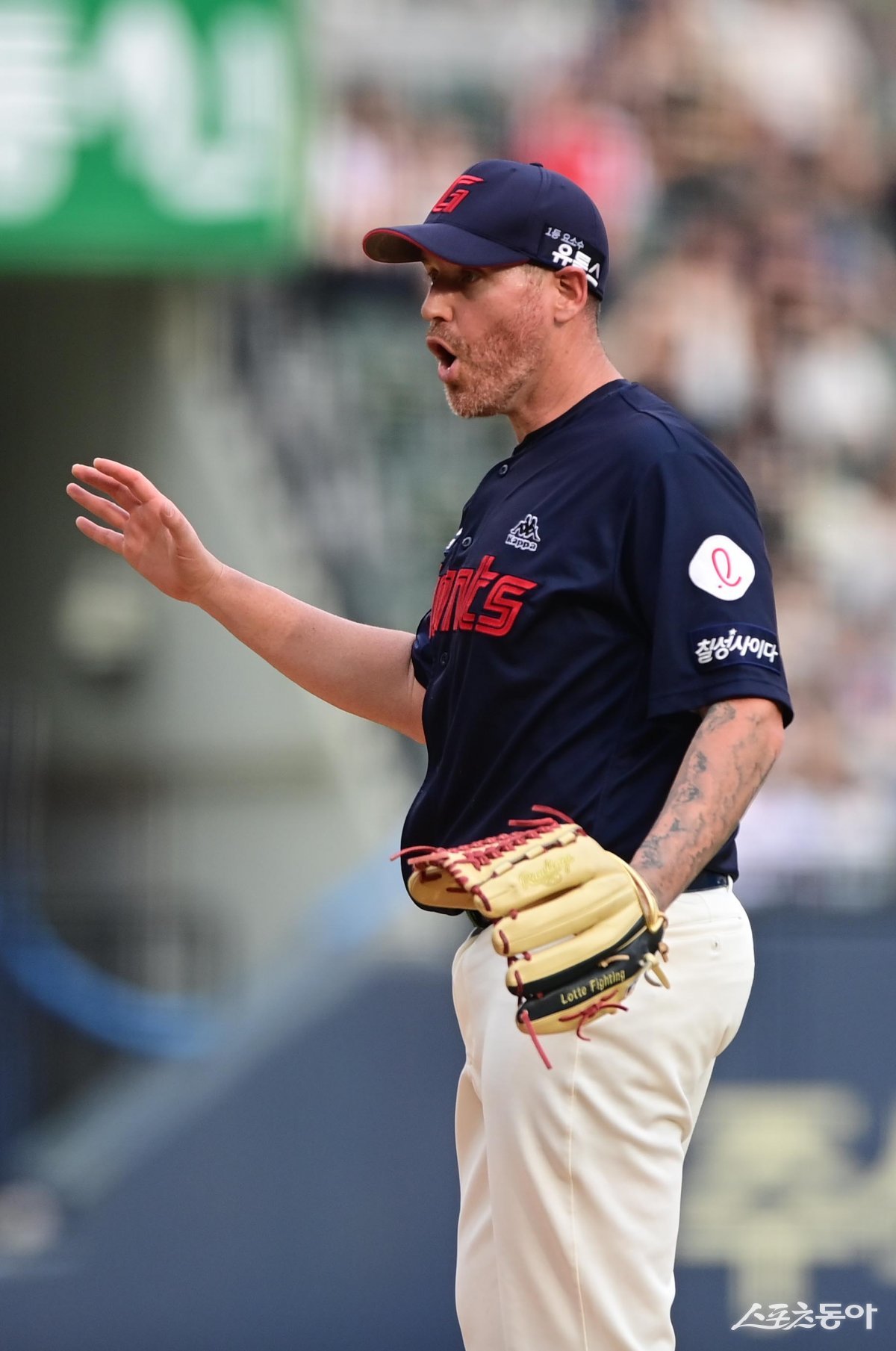 25일 서울 잠실야구장에서 열린 ‘2023 신한은행 SOL KBO리그’ LG 트윈스와 롯데 자이언츠의 경기에서 2회말 1사 1, 2루 LG에 볼넷을 허용한 롯데 스트레일리가 아쉬워하고 있다.