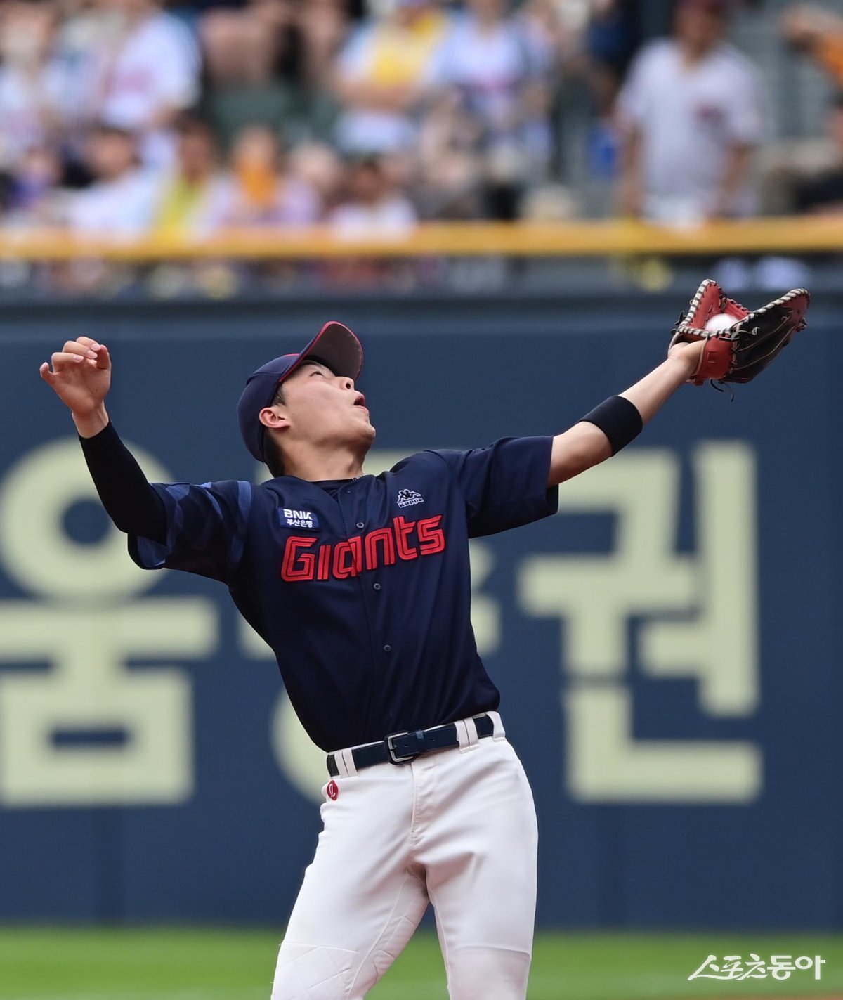 25일 서울 잠실야구장에서 열린 ‘2023 신한은행 SOL KBO리그’ LG 트윈스와 롯데 자이언츠의 경기에서 1회말 2사 2루 LG의 뜬공 때 롯데 1루수 고승민이 볼을 잡고 있다.