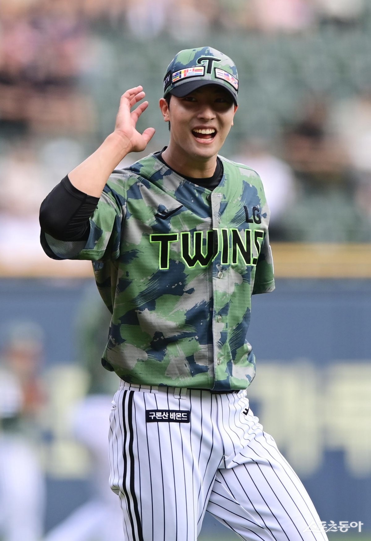 25일 서울 잠실야구장에서 열린 ‘2023 신한은행 SOL KBO리그’ LG 트윈스와 롯데 자이언츠의 경기에서 1회초 1사 1, 2루 롯데에 뜬공으로 아웃을 만든 LG 이정용이 기뻐하고 있다.