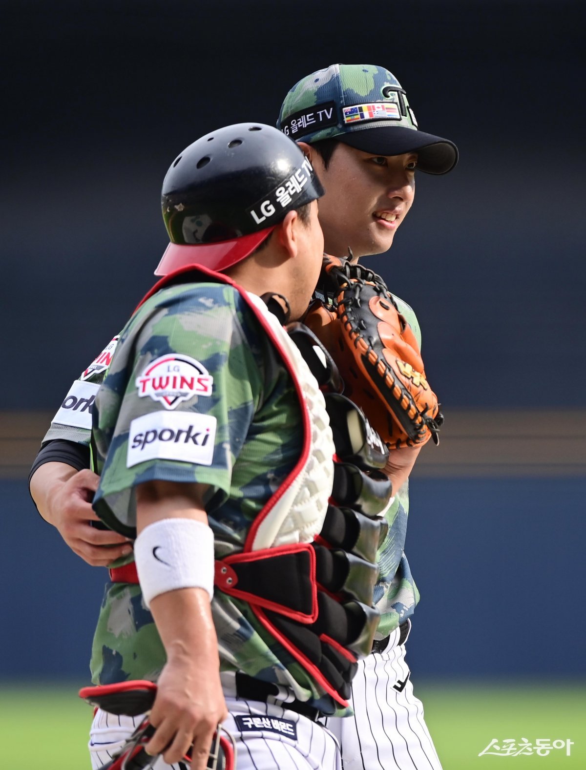 25일 서울 잠실야구장에서 열린 ‘2023 신한은행 SOL KBO리그’ LG 트윈스와 롯데 자이언츠의 경기에서 1회초 무실점으로 수비를 마친 LG 이정용이 포수와 이야기를 하고 있다.