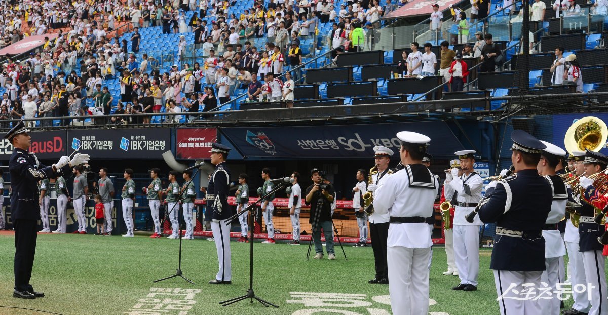 25일 서울 잠실야구장에서 열린 ‘2023 신한은행 SOL KBO리그’ LG 트윈스와 롯데 자이언츠의 경기에 앞서 국방부 군악대대가 연주로 애국가를 제창하고 있다.