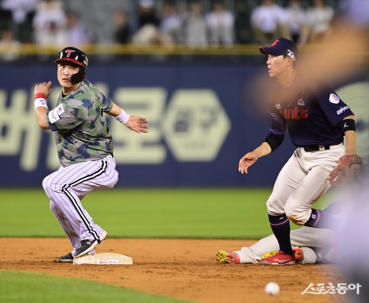 25일 서울 잠실야구장에서 열린 ‘2023 신한은행 SOL KBO리그’ LG 트윈스와 롯데 자이언츠의 경기에서 8회말 1사 1, 2루 LG의 내야 땅볼 때 1루주자 박동원이 롯데의 실책으로 떨어진 볼을 바라보고 있다.
