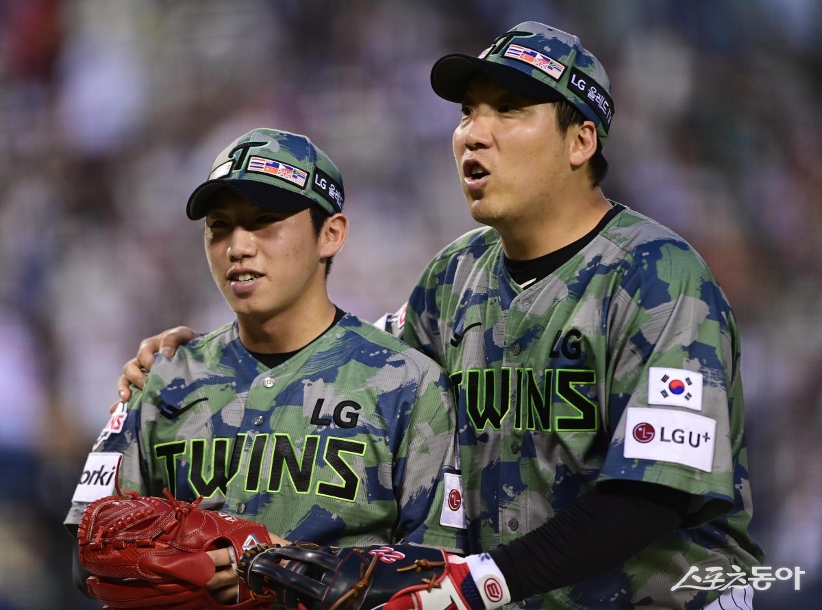 25일 서울 잠실야구장에서 열린 ‘2023 신한은행 SOL KBO리그’ LG 트윈스와 롯데 자이언츠의 경기에서 7회초 수비를 마친 LG 박명근과 김현수가 이야기를 하고 있다.