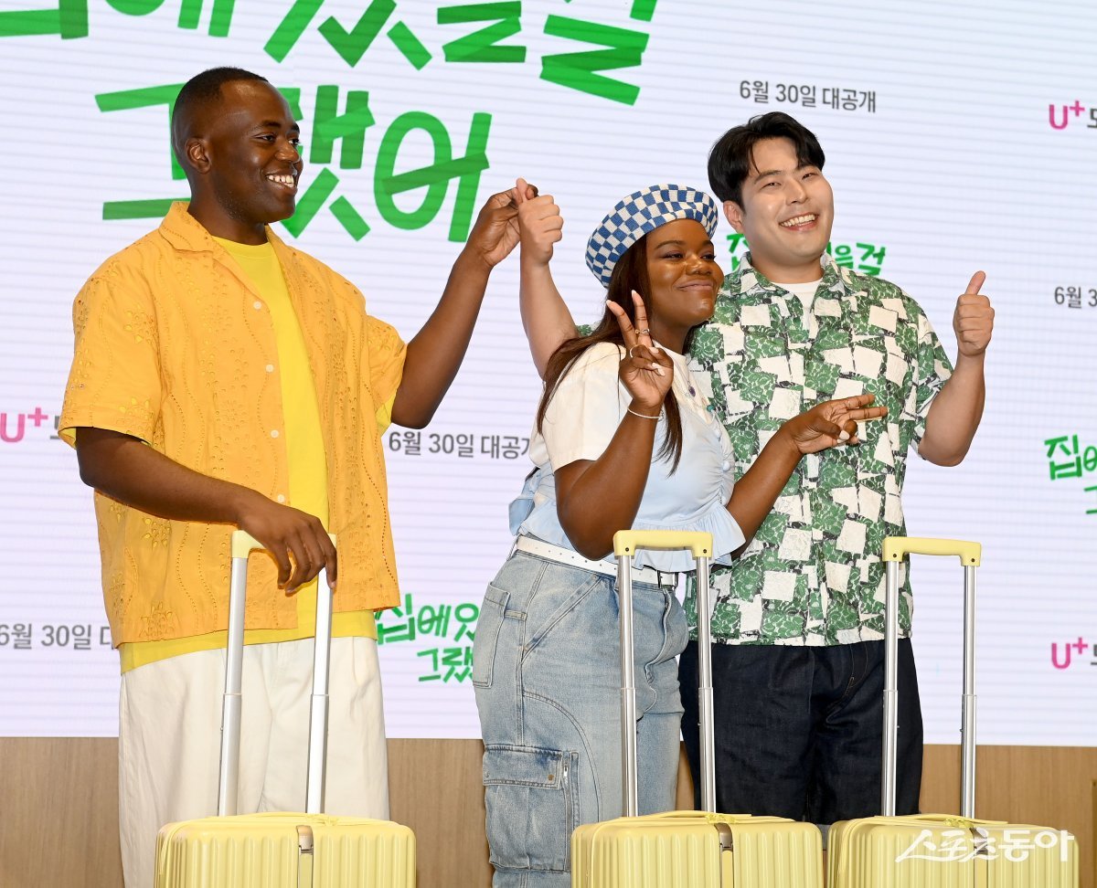 조나단, 파트리샤, 김해준이 26일 서울 용산구 LG유플러스 용산 사옥에서 진행된 예능 프로그래 ‘집에 있을걸 그랬어’ 제작발표회에서 포토타임을 갖고 있다.