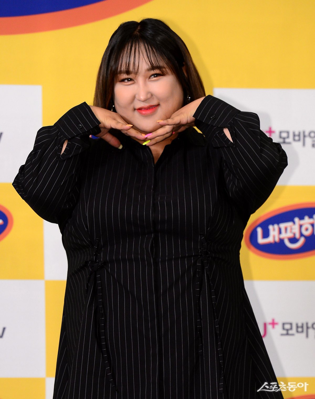 27일 서울 서초구 리버사이드호텔에서 열린 U+모바일tv 새 예능 ‘내편하자’ 기자 간담회에 참석한 풍자가 카메라를 향해 포즈를 취하고 있다.