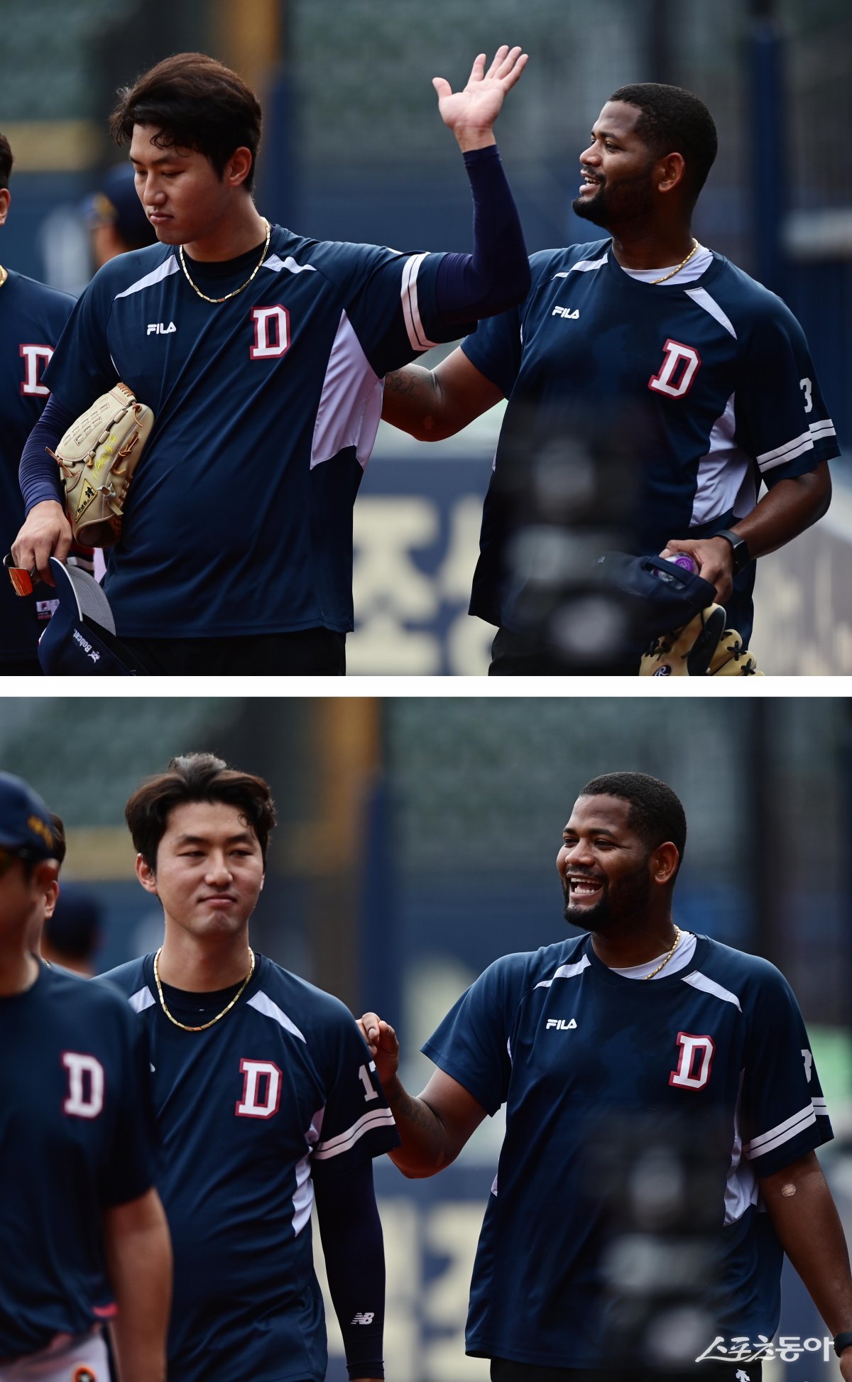28일 서울 잠실야구장에서 열린 ‘2023 신한은행 SOL KBO리그’ 두산 베어스와 NC 다이노스의 경기에 앞서 두산 알칸타라가 홍건희에게 장난을 친 후 웃고 있다.