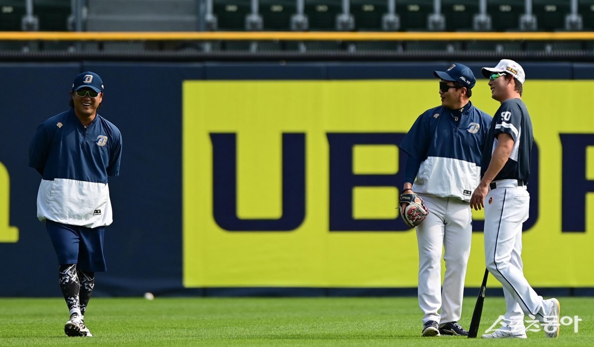 28일 서울 잠실야구장에서 열린 ‘2023 신한은행 SOL KBO리그’ 두산 베어스와 NC 다이노스의 경기에 앞서 NC 박석민, 이종욱 코치, 두산 고영민 코치가 이야기를 하고 있다.
