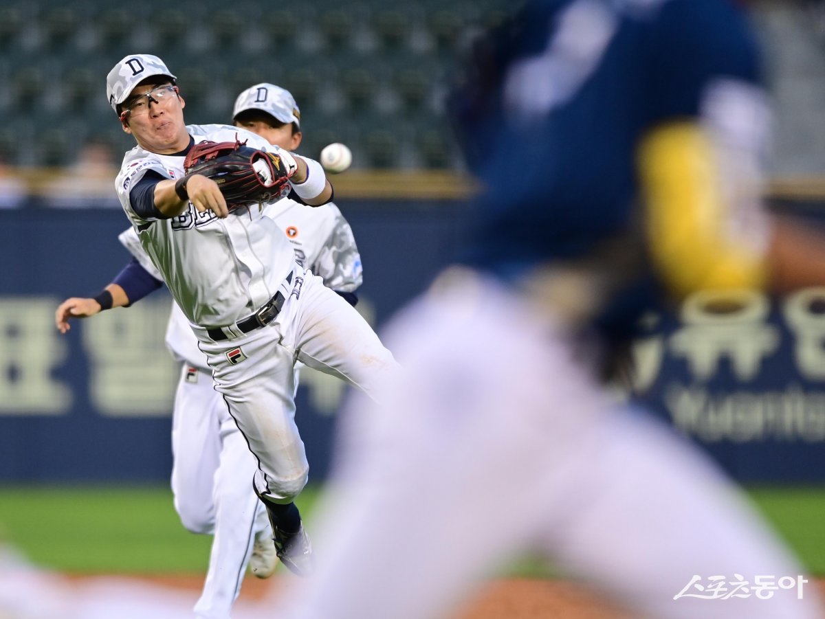 28일 서울 잠실야구장에서 열린 ‘2023 신한은행 SOL KBO리그’ 두산 베어스와 NC 다이노스의 경기에서 5회초 2사 NC의 내야 땅볼 때 두산 허경민이 볼을 잡아 1루로 송구하고 있다.