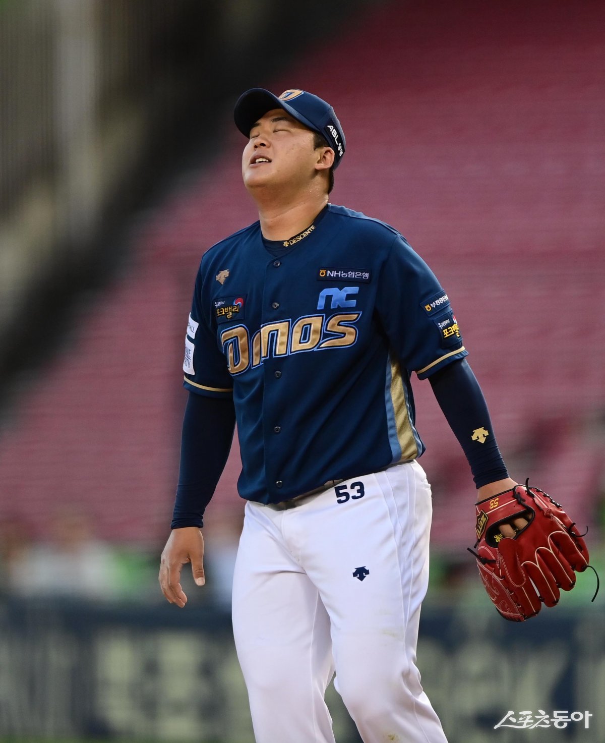28일 서울 잠실야구장에서 열린 ‘2023 신한은행 SOL KBO리그’ 두산 베어스와 NC 다이노스의 경기에서 4회말 1사 두산 양석환의 뜬공이 담장 앞에서 잡히자 NC 신민혁이 안도의 숨을 쉬고 있다.