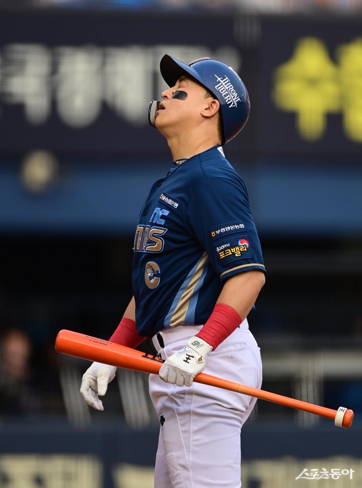 28일 서울 잠실야구장에서 열린 ‘2023 신한은행 SOL KBO리그’ 두산 베어스와 NC 다이노스의 경기에서 3회초 무사 NC 손아섭이 삼진 아웃을 당한 후 아쉬워하고 있다.