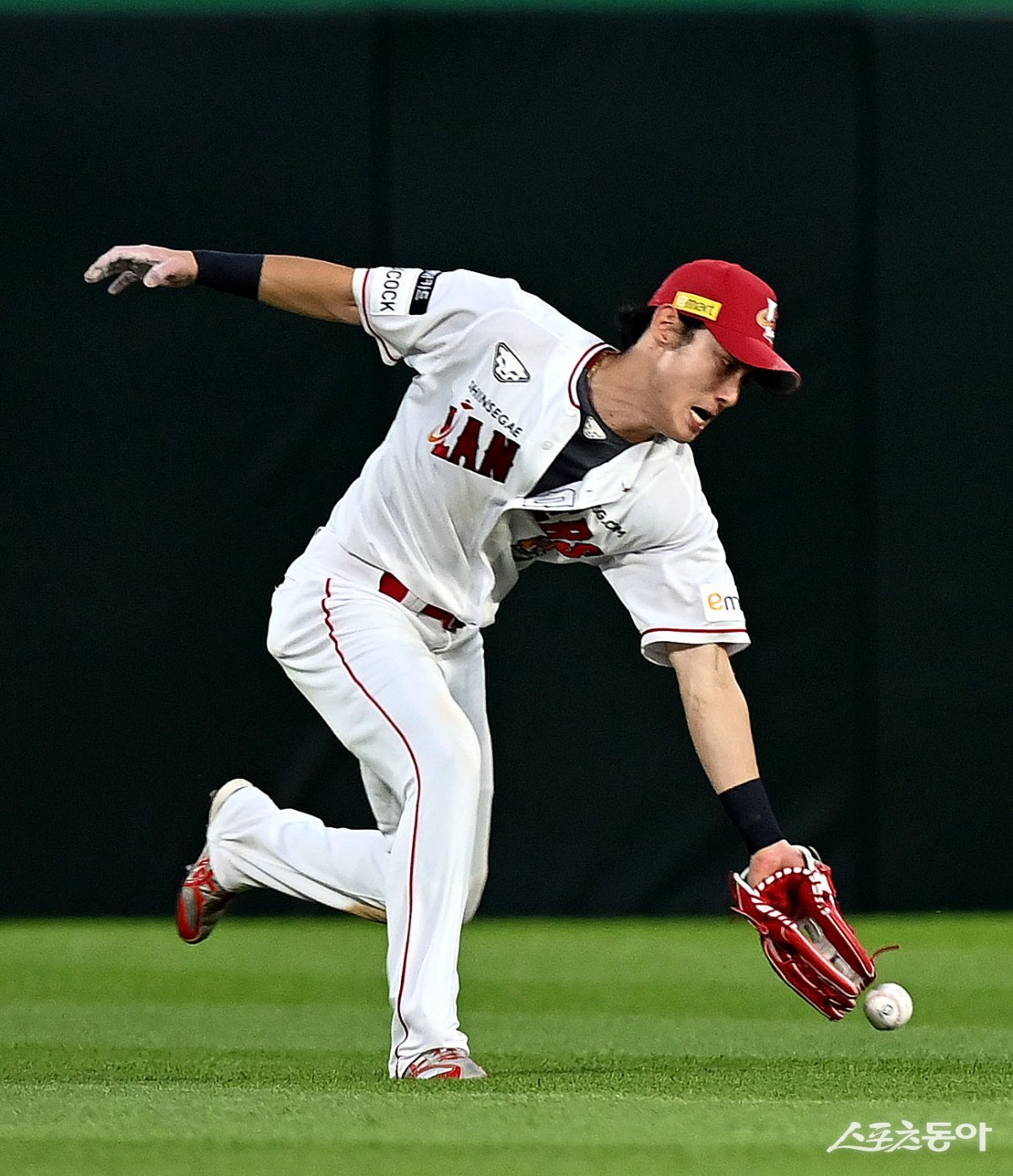 27일 인천 SSG 랜더스필드에서 ‘2023 신한은행 SOL KBO리그’ SSG 랜더스와 LG 트윈스의 경기가 열렸다. 5회초 1사 2, 3루에서 SSG 최지훈이 타구를 잡기 위해 손을 뻗었으나 잡지 못하고 있다.