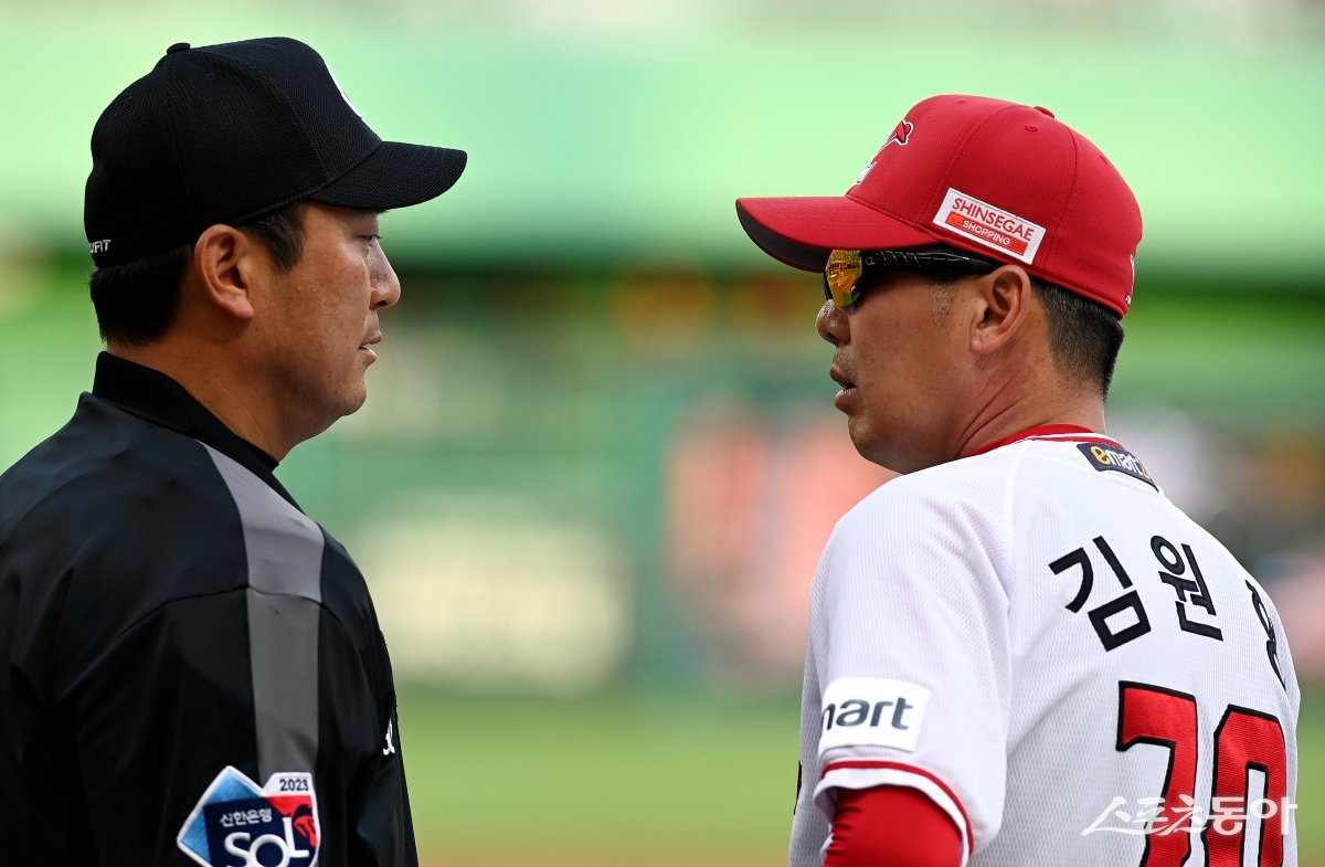27일 인천 SSG 랜더스필드에서 ‘2023 신한은행 SOL KBO리그’ SSG 랜더스와 LG 트윈스의 경기가 열렸다. 2회초 무사에서 LG 번트 안타 때 SSG 김원형 감독이 송수근 주심에게 항의하고 있다.