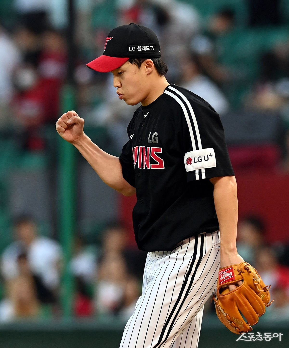 27일 인천 SSG 랜더스필드에서 ‘2023 신한은행 SOL KBO리그’ SSG 랜더스와 LG 트윈스의 경기가 열렸다. 3회말 2사 1, 2루에서 LG 선발 임찬규가 투수 앞 땅볼로 아웃시킨 후 주먹을 쥐며 환호하고 있다.
