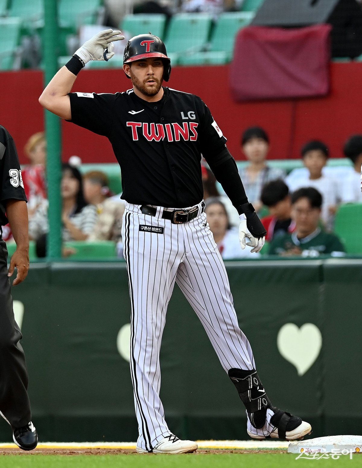 27일 인천 SSG 랜더스필드에서 ‘2023 신한은행 SOL KBO리그’ SSG 랜더스와 LG 트윈스의 경기가 열렸다. 1회초 2사 2루에서 LG 오스틴이 1타점 적시타를 날린 후 세리머니를 펼치고 있다.