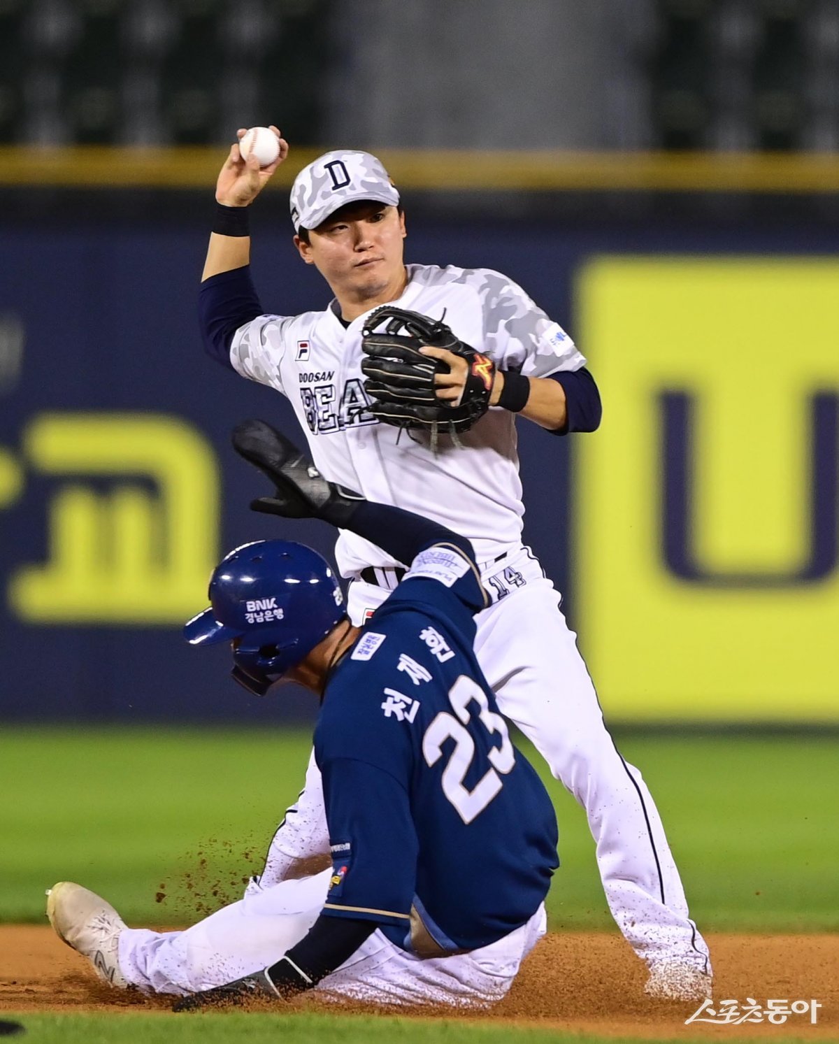 28일 서울 잠실야구장에서 열린 ‘2023 신한은행 SOL KBO리그’ 두산 베어스와 NC 다이노스의 경기에서 7회초 1사 1, 2루 NC의 내야 땅볼 때 두산 박계범이 1루주자를 포스 아웃시킨 후 1루로 송구하고 있다.