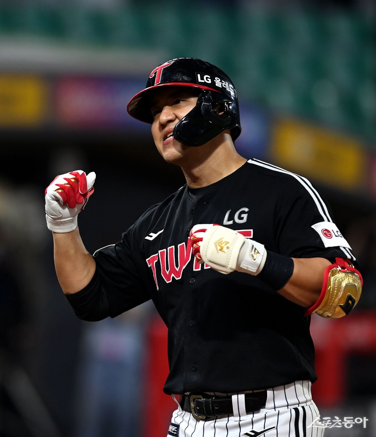 27일 인천 SSG 랜더스필드에서 ‘2023 신한은행 SOL KBO리그’ SSG 랜더스와 LG 트윈스의 경기가 열렸다. 6회초 무사 1루에서 LG 김민성이 투런 홈런을 쏘아 올린 후 환호하고 있다.