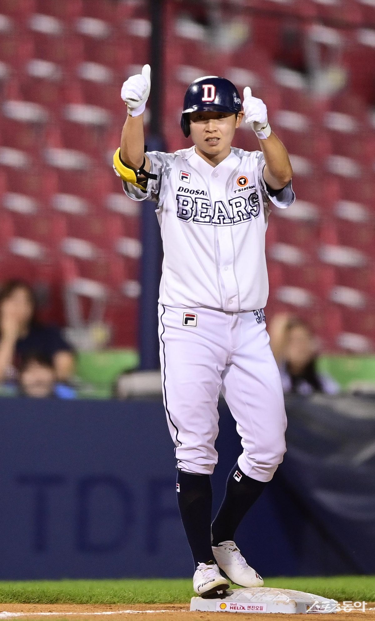 28일 서울 잠실야구장에서 열린 ‘2023 신한은행 SOL KBO리그’ 두산 베어스와 NC 다이노스의 경기에서 8회말 2사 1루 두산 정수빈이 1타점 중전 3루타를 친 후 세리머니를 하고 있다.
