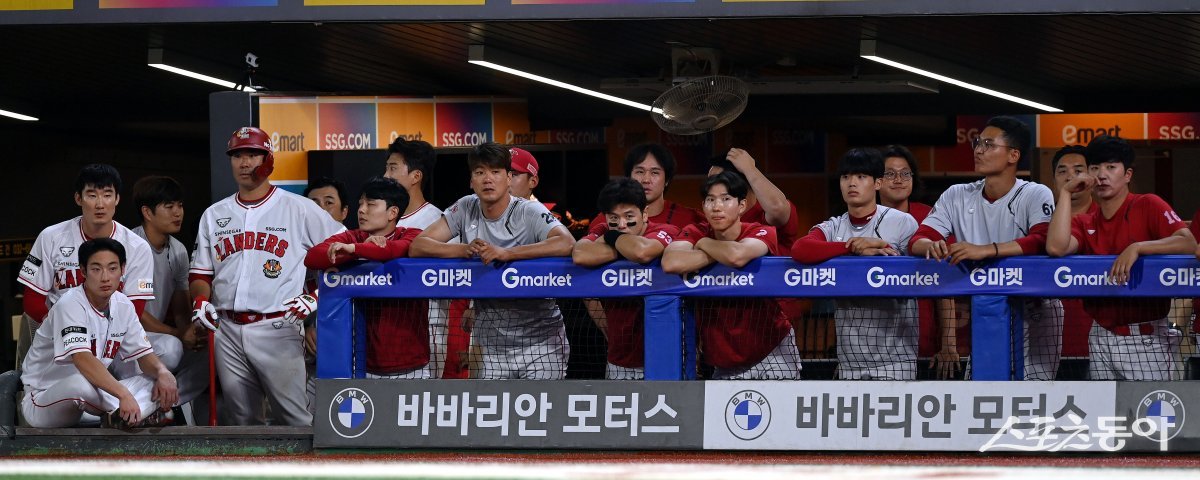 27일 인천 SSG 랜더스필드에서 ‘2023 신한은행 SOL KBO리그’ SSG 랜더스와 LG 트윈스의 경기가 열렸다. 0-14로 뒤진 SSG 9회말 마지막 공격 때 선수들이 더그아웃에서 경기를 지켜보고 있다.