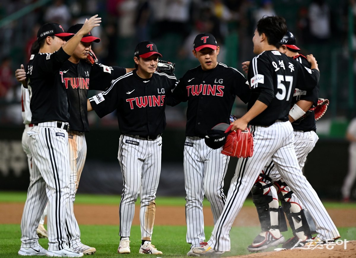27일 인천 SSG 랜더스필드에서 ‘2023 신한은행 SOL KBO리그’ SSG 랜더스와 LG 트윈스의 경기가 열렸다. LG가 SSG를 상대로 14-0 승리를 거두며 1위를 탈환 후 선수들이 그라운드에서 기쁨을 나누고 있다.