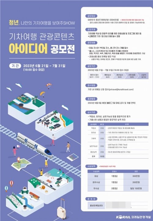 코레일관광개발은 7월31일까지 ‘2023 청년, 나만의 기차여행을 보여주SHOW_기차여행 관광콘텐츠 아이디어 공모전’을 진행한다.
