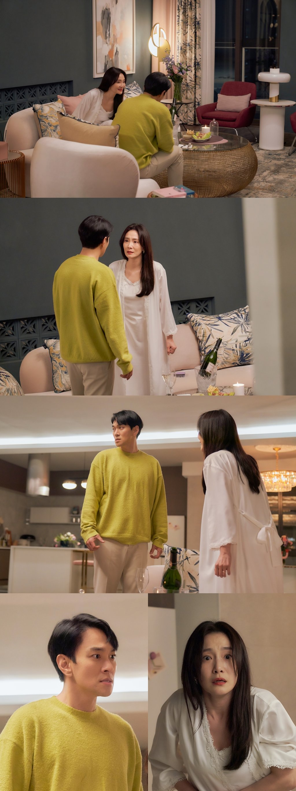 오늘(28일) 9회 방송을 앞두고 공개된 스틸컷에는 와인파티를 즐기고 있는 오유진-강도준 부부의 오붓한 모습이 담겨있다. 사망 당일 오유진이 SNS에 올린 것처럼, 아이들을 캠핑에 보내고 부부만의 시간을 보내고 있는 것.