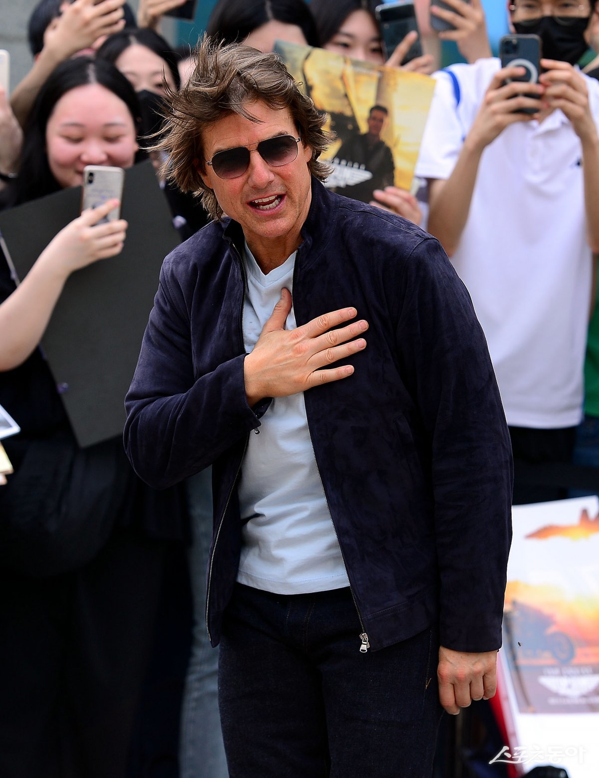 28일 영화배우 톰 크루즈가 영화 ‘미션임파서블: 데드 레코팅 PART ONE’ 프로모션 참석차 김포국제공항을 통해 입국해 팬들에게 인사를 하고 있다.