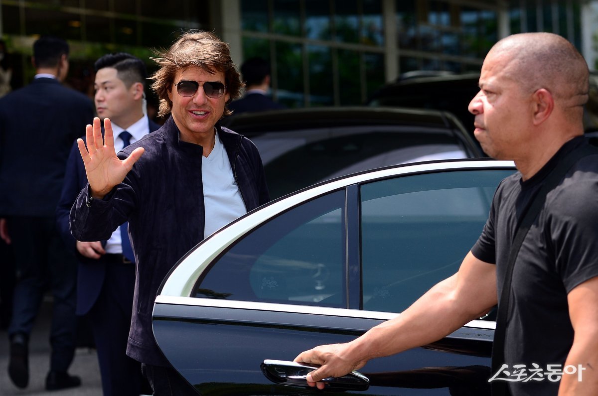 28일 영화배우 톰 크루즈가 영화 ‘미션임파서블: 데드 레코팅 PART ONE’ 프로모션 참석차 김포국제공항을 통해 입국해 팬들에게 인사를 하고 있다.