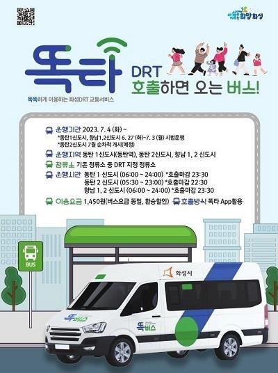 경기도와 경기교통공사(이하 공사)는 지난 27일 동탄1신도시와 향남지구에서 시범 운행에 들어간 똑버스를 다음 달 4일부터 정식 운행한다고 28일 밝혔다. 차량은 13인승 현대 쏠라티 차량으로 5대씩, 총 10대를 매일 오전 6시부터 자정까지 운행한다.