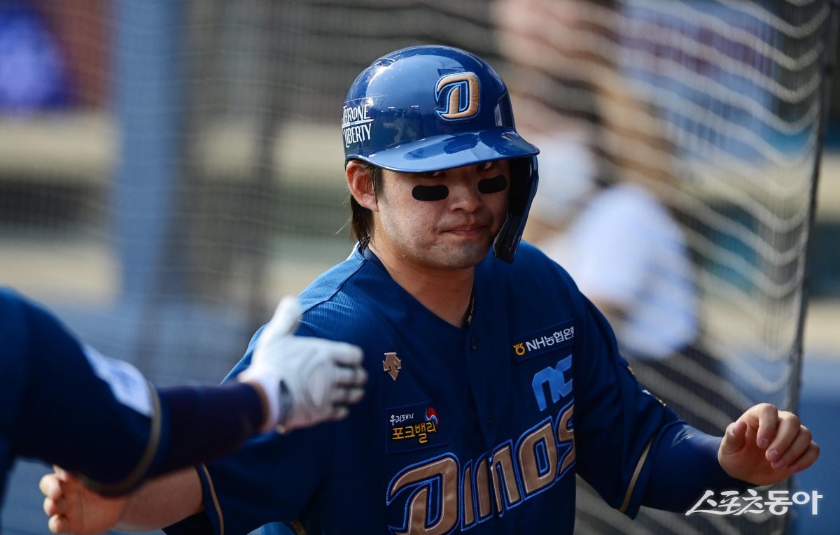 28일 서울 잠실야구장에서 열린 ‘2023 신한은행 SOL KBO리그’ 두산 베어스와 NC 다이노스의 경기에서 4회초 1사 만루 NC의 우전 적시타 때 득점에 성공한 3루주자 윤형준이 더그아웃에서 동료들에 축하를 받고 있다.