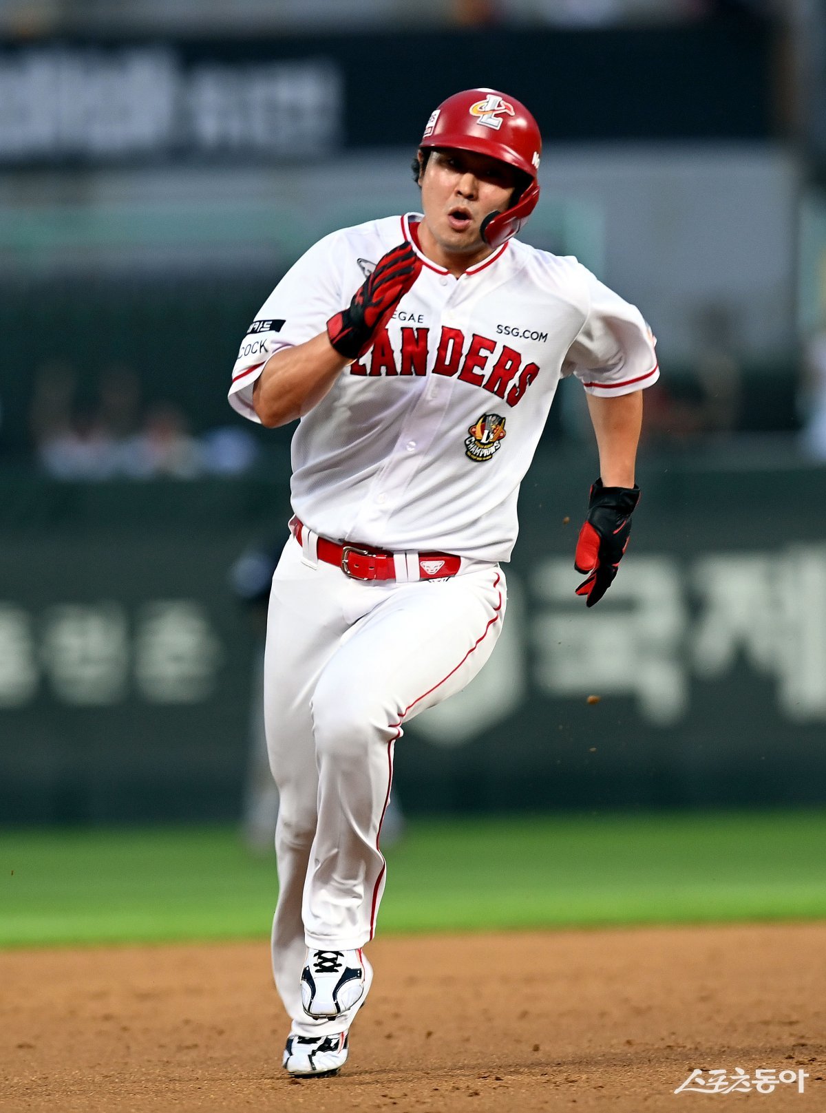 28일 인천 SSG 랜더스필드에서 ‘2023 신한은행 SOL KBO리그’ SSG 랜더스와 LG 트윈스의 경기가 열렸다. 3회말 1사 1루에서 안타 때 SSG 1루 주자 최정이 3루로 달리고 있다.