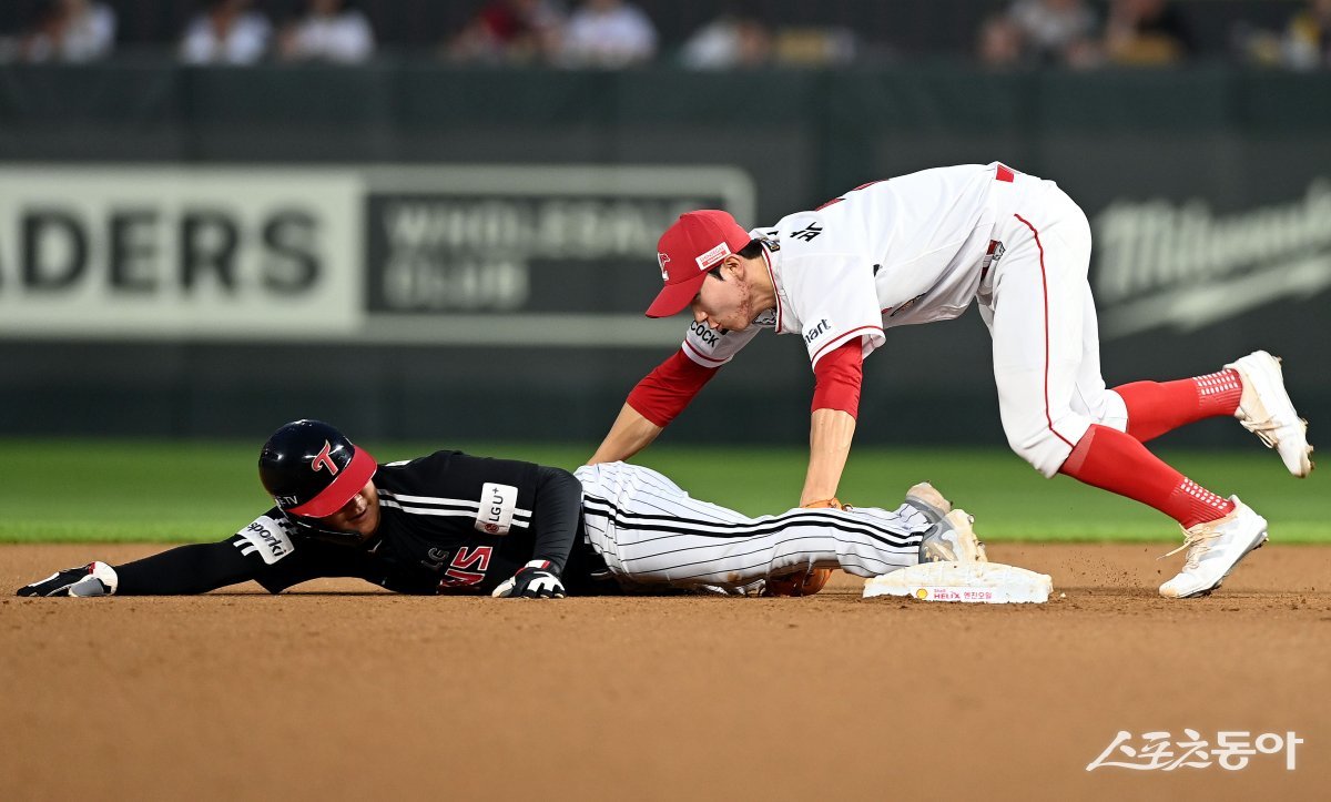 28일 인천 SSG 랜더스필드에서 ‘2023 신한은행 SOL KBO리그’ SSG 랜더스와 LG 트윈스의 경기가 열렸다. 4회초 2사 1루에서 LG 문보경이 2루 도루를 성공하고 있다.
