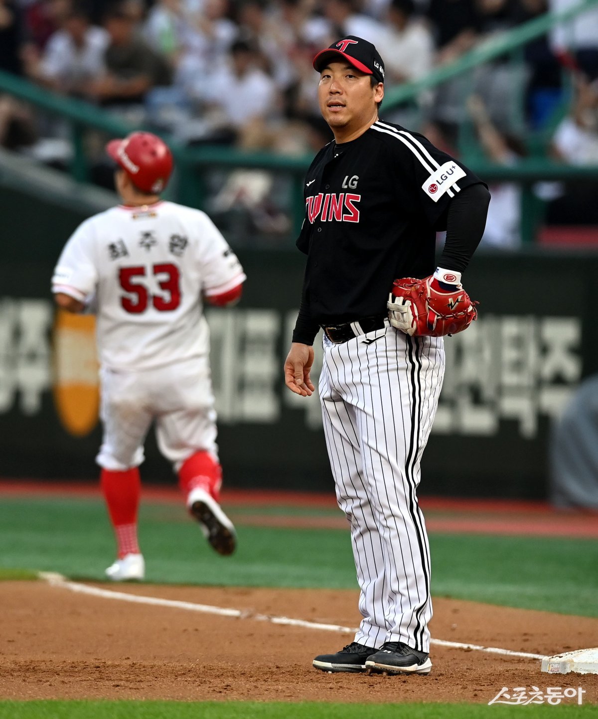 28일 인천 SSG 랜더스필드에서 ‘2023 신한은행 SOL KBO리그’ SSG 랜더스와 LG 트윈스의 경기가 열렸다. 1회말 무사 1루에서 LG 김현수가 내야땅볼 타구를 빠뜨리며 실책을 범하고 있다.