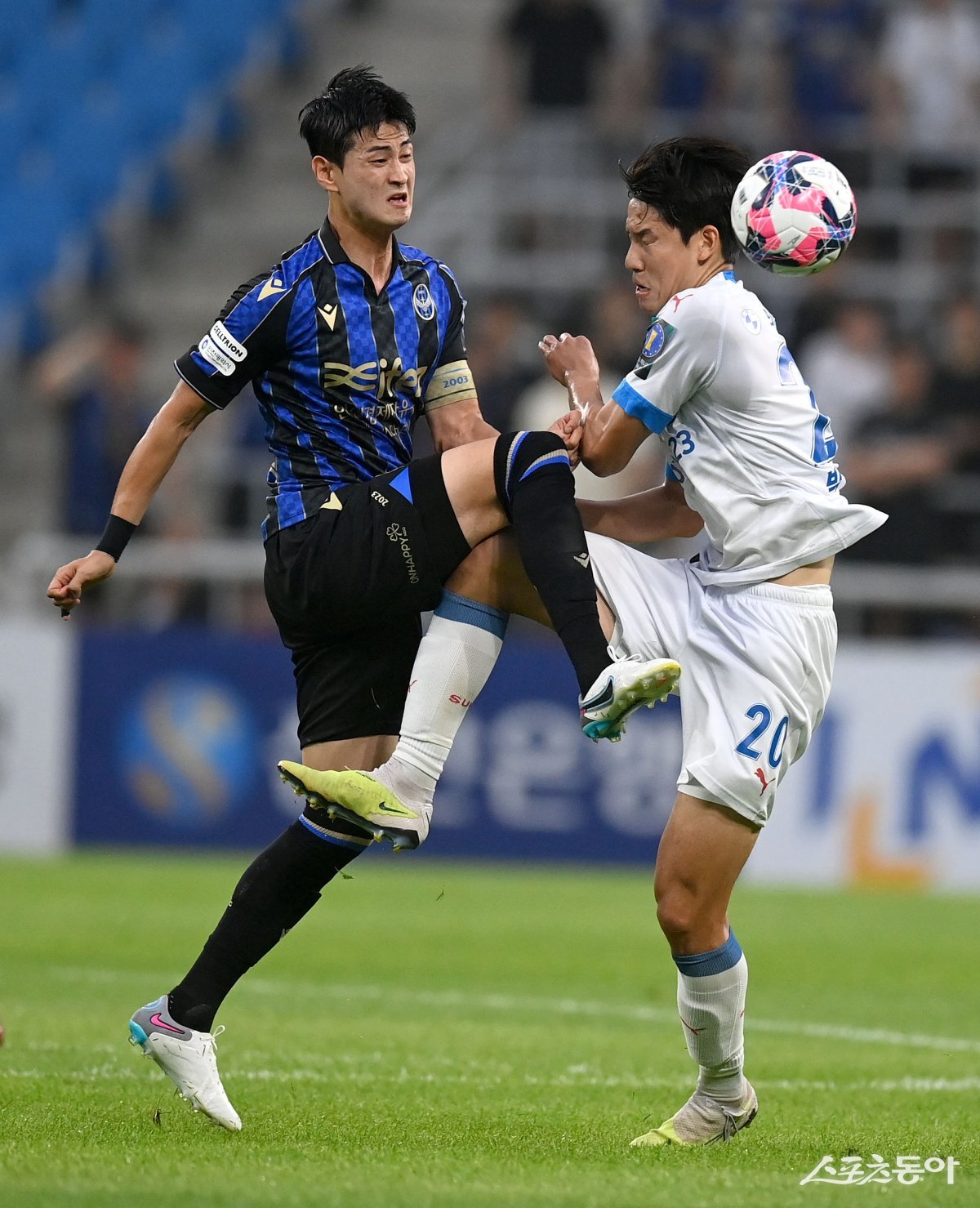 28일 인천축구전용경기장에서 열린 프로축구 ‘2023 하나원큐 대한축구협회(FA)컵’ 8강전 인천과 수원 경기에서 인천 문지환과 수원 박희준이 볼다툼을 하다 충돌하고 있다.