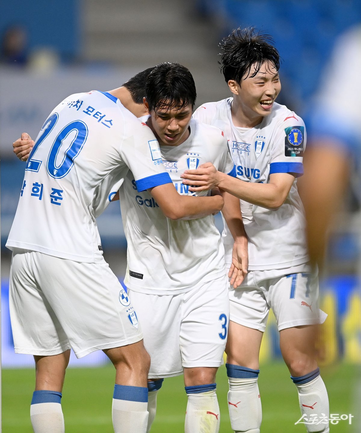 28일 인천축구전용경기장에서 열린 프로축구 ‘2023 하나원큐 대한축구협회(FA)컵’ 8강전 인천과 수원 경기에서 수원 명준재(가운데)가 다시 앞서가는 골을 성공시킨 후 기뻐하고 있다.