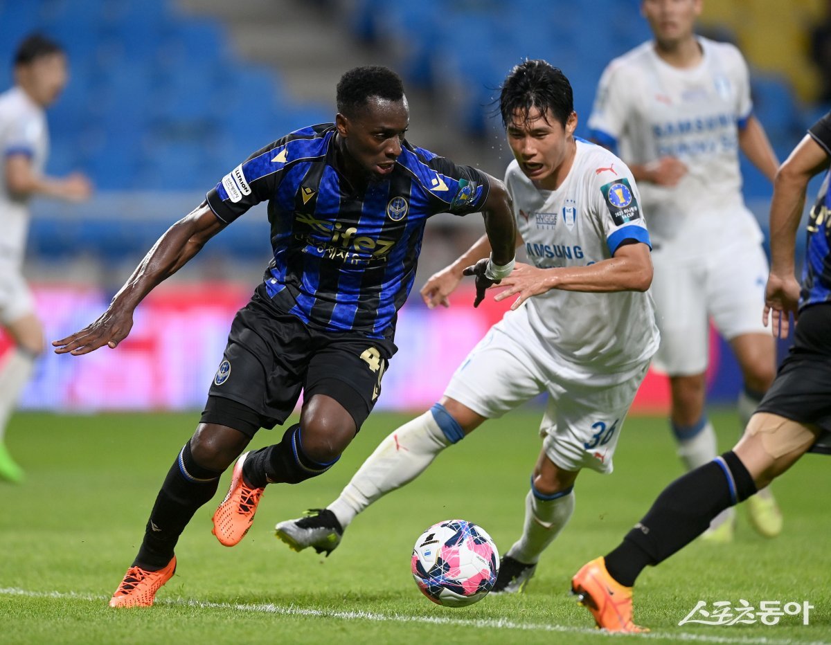 28일 인천축구전용경기장에서 열린 프로축구 ‘2023 하나원큐 대한축구협회(FA)컵’ 8강전 인천과 수원 경기에서 인천 으포쿠가 수원의 수비를 뚫고 공격하고 있다.
